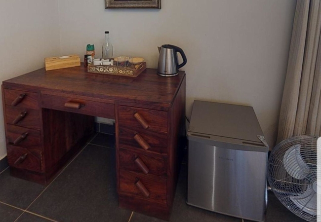 This suite is furnished with a Queen-size bed. The en-suite bathroom is fitted with a shower, toilet and basin. The room is equipped with a 32" LED TV with SABC channels, e-TV and selected DSTV channels, Bar fridge, Air-con, coffee and tea facilities.