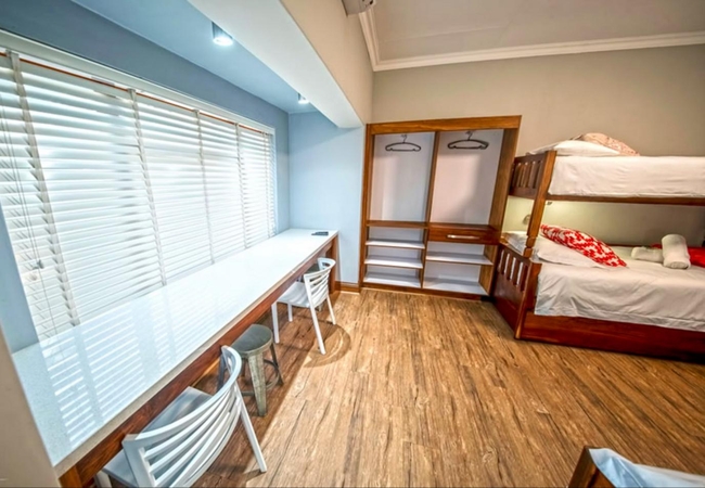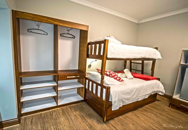 The Large Twin Room sleeps 4four and is furnished with two twin beds and a bunk bed. The room features an en-suite bathroom, air conditioning, Wi-Fi, a TV with DStv, a microwave, a bar fridge, coffee/tea facilities, a hairdryer, and a heater.