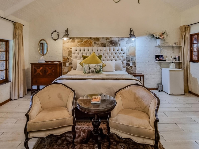 Garden Cottage (family unit). Main bedroom with queen bed, full bathroom, lounge area with twin beds at the side. Bar fridge, coffee/tea station, fireplace and hotel package DStv. Situated near the trout dam, but not with direct view.