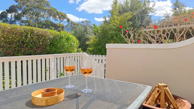 The open plan living and dining area is comfortably appointed and designed for relaxed living. French doors open onto a covered wooden deck with outdoor furniture, allowing guests to enjoy peaceful garden views. A television with an Android box is available for entertainment.