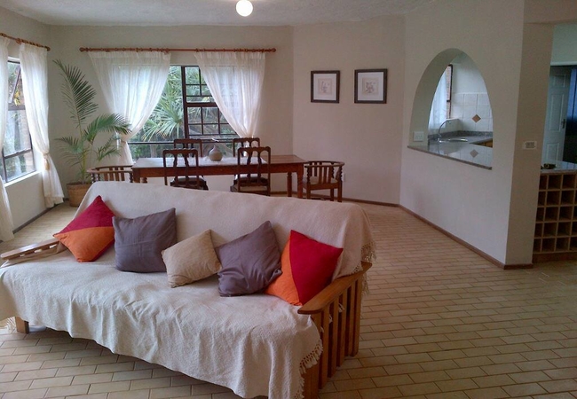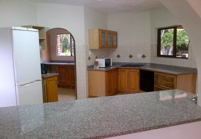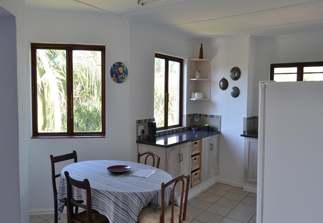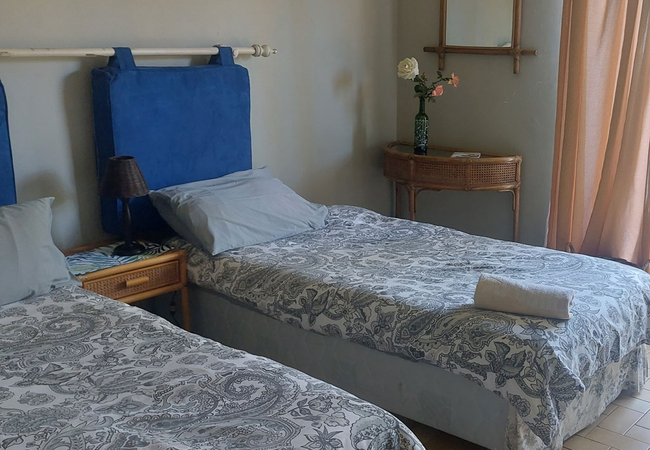 Main House Upstairs Flat has two bedrooms sharing one bathroom with a shower and toilet. There is a large lounge where 2 single beds can be added for an additional 2 guests. Open plan kitchen and dining area with stove and fridge / freezer. The main bedroom has a sea view and queen size bed. The second bedroom has twin beds. There is an outside balcony overlooking the pool and a sunken garden with a built in braai.