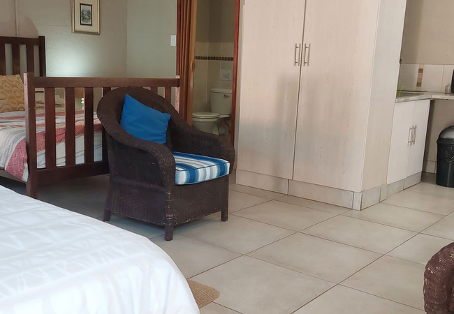 Garden Unit Four can accommodate two adults and one child. This unit is approximately 50 m from the main house. It features a double bed, a single bed can be added if required. the shower and toilet is en-suite, and there is kitchenette equipped with a small stove and fridge/freezer. This unit has its own outside braai and seating area adjacent to units 1 to 3.