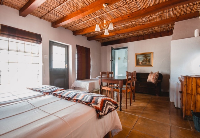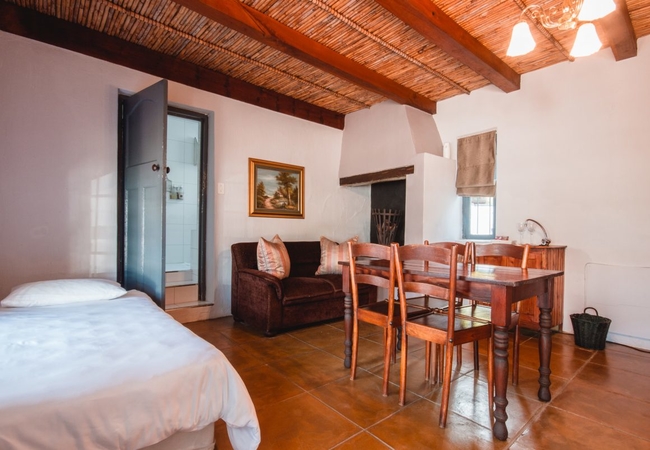 This popular Family unit consist of two separate inter-leading rooms, with double bed and the other room with two single beds, big wooden baby cot and lounge area in front of the old fireplace. The bedrooms are further equipped with air-conditioning, fridges and electric blankets.