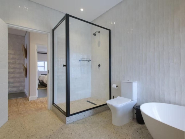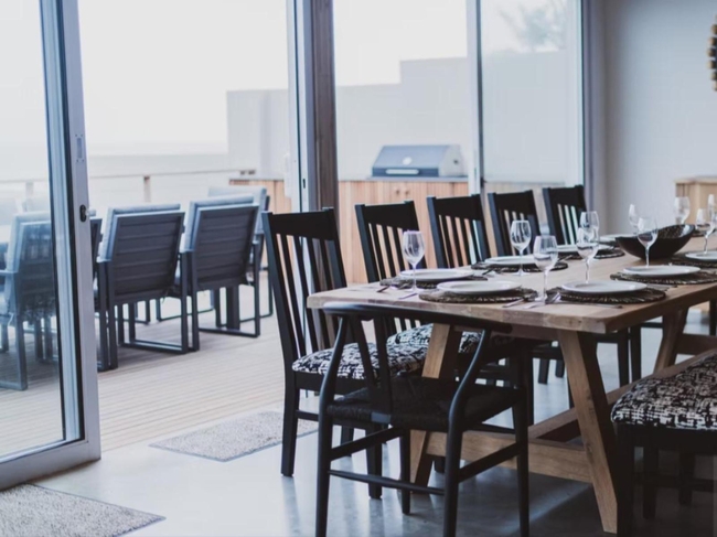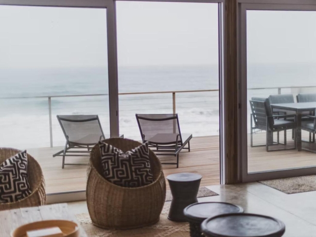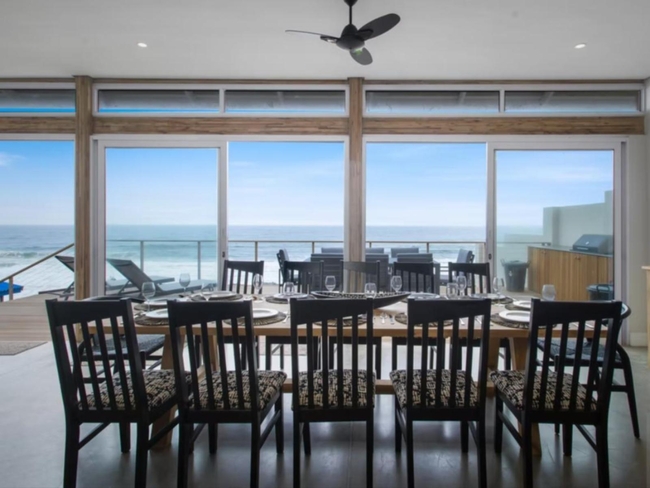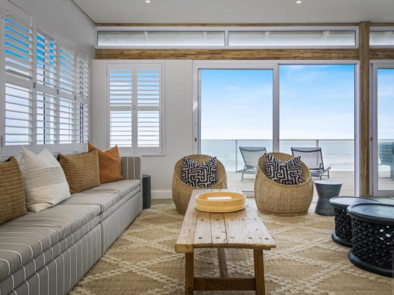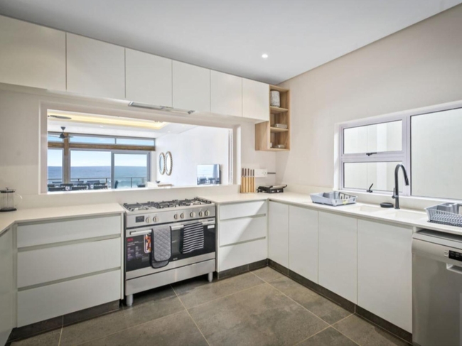 From here, sliding doors lead to the outdoor area, which features a gas braai, a charcoal Weber, an eight-seater dining table, a fire pit, and a private fenced garden with panoramic ocean views.