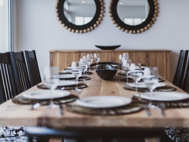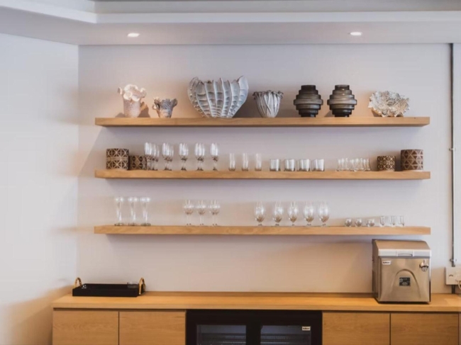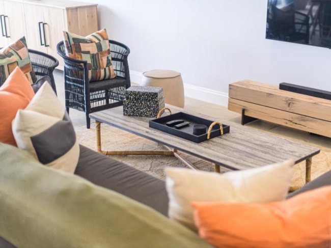 The open-plan living area provides uncapped Wi-Fi and a comfortable lounge with a Smart TV offering access to all major apps. There is an entertainment bar with a double bar fridge, an ice machine, and its own Smart TV, along with a dining table that seats twelve guests.