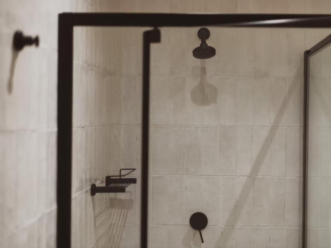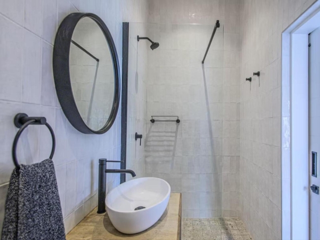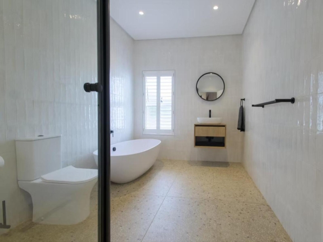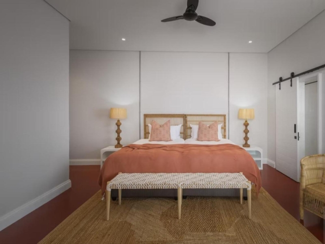 Bedroom One is the master suite, featuring two three-quarter twin beds, black-out curtains with shutters, a ceiling fan, and an en-suite bathroom with a single basin, a shower, and an open-plan toilet. Bedroom Two contains two three-quarter twin beds, black-out curtains, a ceiling fan, and has access to a full shared family bathroom situated across the hallway.