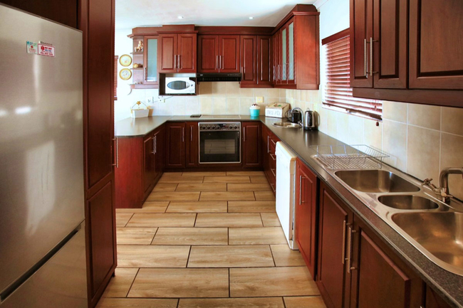 The property accommodates up to 8 guests, offering 4 bedrooms and 3 bathrooms. Three of the bedrooms each feature a queen-size bed, with two of them enjoying en-suite bathrooms that include a shower, washbasin, and toilet. The fourth bedroom is furnished with two single beds and makes use of a separate bathroom, also fitted with a shower, washbasin, and toilet. Fresh linen and towels are provided for guests’ comfort. The open-plan kitchen, designed for easy self-catering, includes a stove, oven, microwave, fridge-freezer, crockery, and cutlery, along with a dishwasher for added convenience. An adjoining dining area offers seating for eight guests, creating a welcoming space for shared meals. The lounge is comfortably furnished and features a TV, while portable rechargeable lights are provided for use during power outages. Outdoors, a built-in braai allows guests to enjoy relaxed evenings with sundowners, complemented by uninterrupted views across the lagoon. Secure on-site parking is available for added peace of mind.