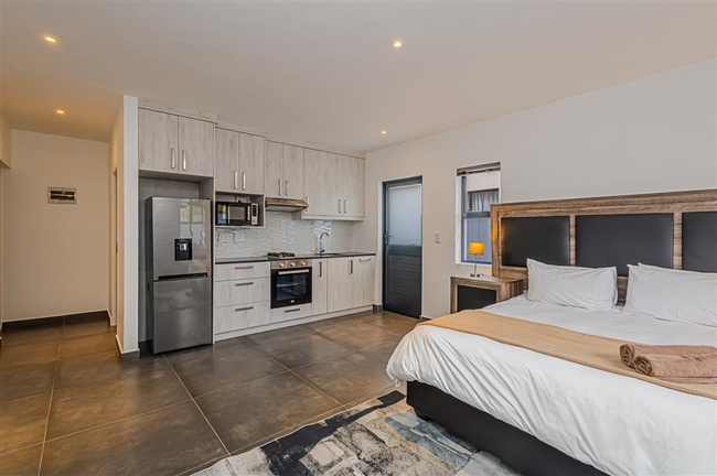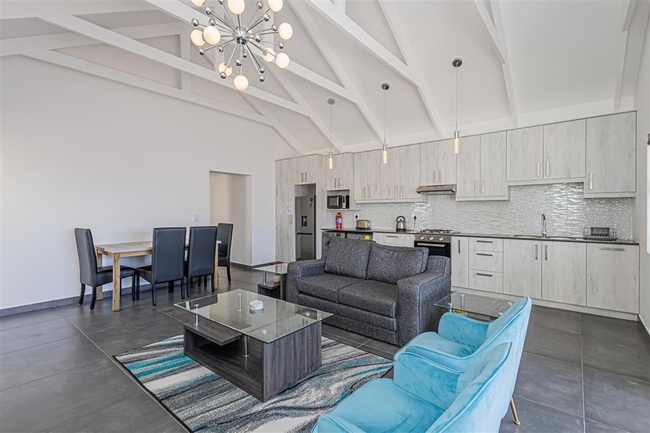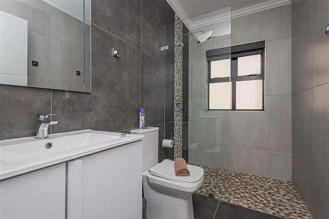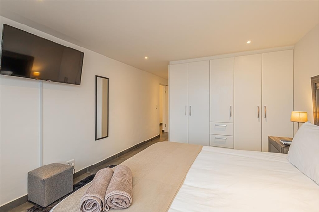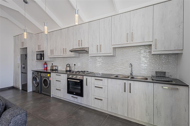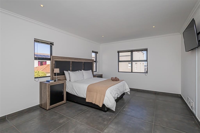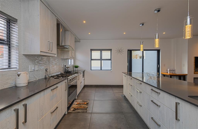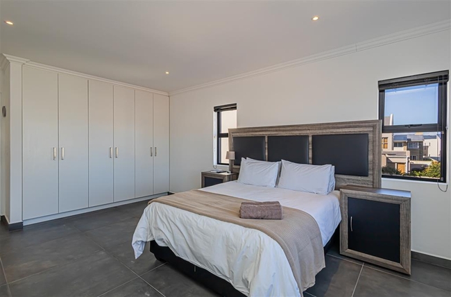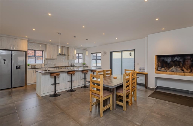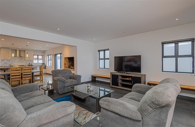 Dalton's is a modern double-storey house that can accommodate eight guests in five bedrooms, four of which are furnished with a Queen-size bed and one bedroom is furnished with two single beds. All the rooms benefit from an en-suite bathroom which is fitted with a shower, toilet and basin. Linen and bath towels are provided but guests need to provide their own swimming towels. The house has a fully tiled main living area which features a kitchen, lounge and dining space with an indoor braai. The kitchen is fully equipped with a gas stove, electric oven, microwave, fridge-freezer, cutlery and crockery as well as a breakfast bar with stools. A dishwasher, washing machine and a tumble-dryer are also available in the separate scullery. The lounge is comfortably furnished and has a TV with a full selection of DStv channels for your entertainment. The living area opens, via stacking doors, to a covered patio with a built-in braai and a swimming pool.
