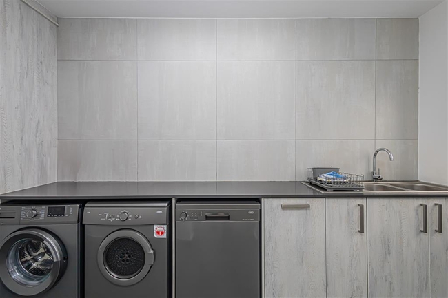 The house has a fully tiled main living area which features a kitchen, lounge and dining space with an indoor braai. The kitchen is fully equipped with a gas stove, electric oven, microwave, fridge-freezer, cutlery and crockery as well as a breakfast bar with stools. A dishwasher, washing machine and a tumble-dryer are also available in the separate scullery. The lounge is comfortably furnished and has a TV with a full selection of DStv channels for your entertainment. Wi-Fi is also available.