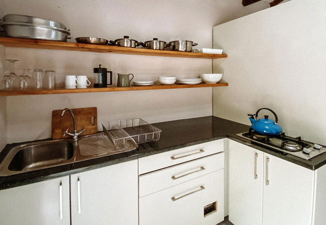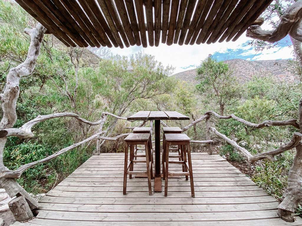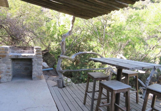 Dassiekrans 4 is a cabin in Groendal Wilderness Area with a mountain view. The cabin is furnished with a King-size bed and two single beds. The en-suite bathroom fitted with a shower, toilet and basin. There is an open plan kitchenette with a 12V camping fridge, a dining area and indoor fireplace. Lighting is supplied by solar powered batteries. Outside there is a patio and an outdoor braai and firepit.