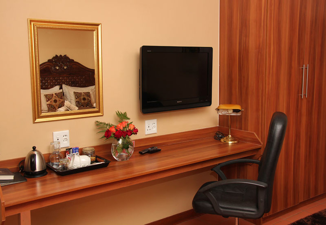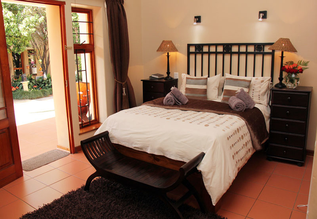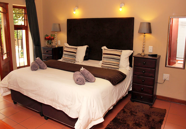 Bedroom with King OR Twin beds (please advise twin beds after confirming your booking, if required). The en-suite bathroom is equipped with a shower. Private entrance, tea tray, air-conditioning, TV with Bouquet Selection of DSTV, crisp bed linen and fresh towels. Wi-Fi and bar fridge.