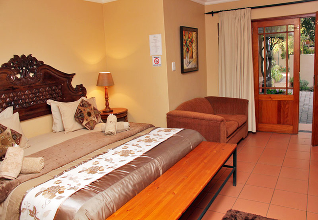This room is furnished with a Queen-size bed and has en-suite bathroom equipped with a shower. There is a private entrance, tea tray, air-conditioning, TV with Bouquet Selection of DSTV, crisp bed linen and fresh towels. Wi-Fi and bar fridge.
