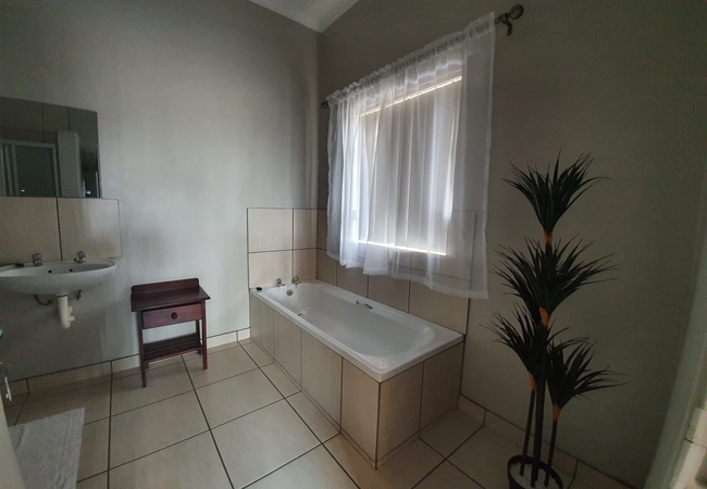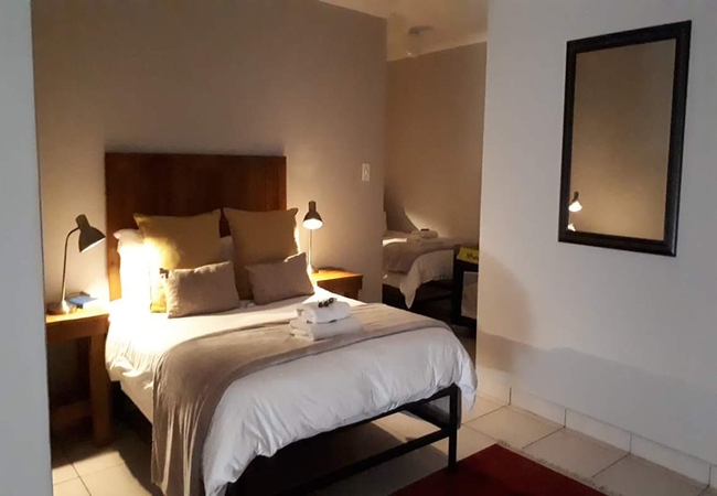Deluxe Double Room are furnished with a double bed, a single bed and an en-suite bathroom fitted with a shower, toilet and basin, There is a kitchenette, an open plan living area, air conditioning and a TV with DStv channels.