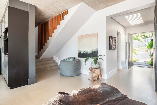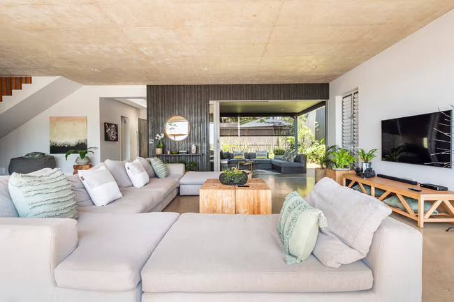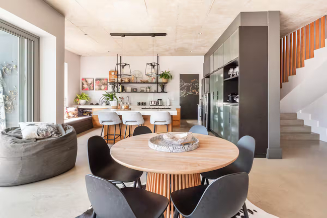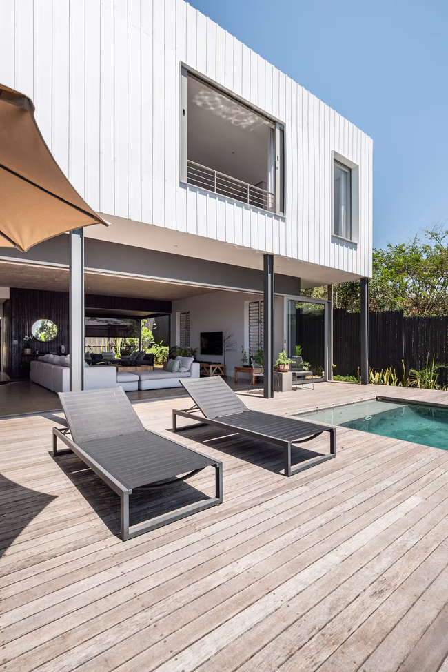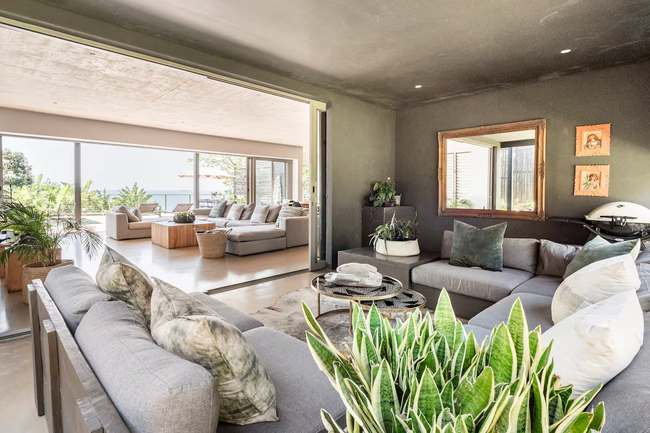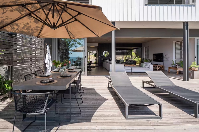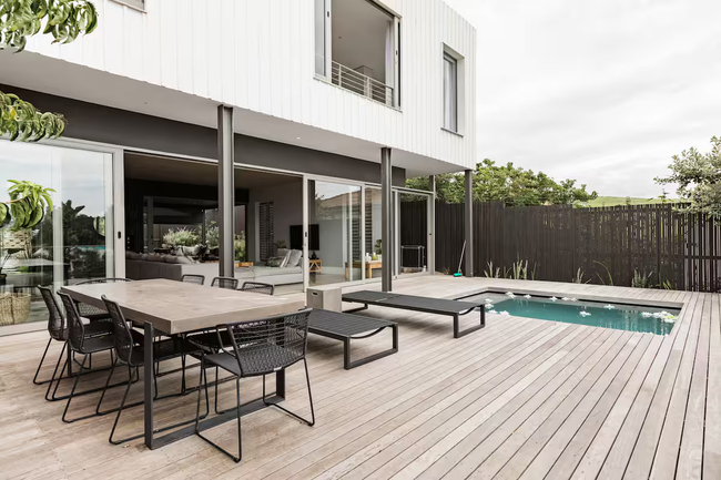 Beyond the interior, Maison de Plage features an inviting deck with a splash pool, ideal for soaking up the sun and enjoying uninterrupted views of the Indian Ocean. A stylish outdoor dining table and comfortable sun loungers create a delightful setting for al fresco meals or peaceful moments with a book.