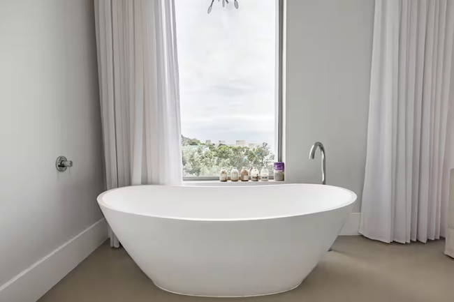 The villa comfortably welcomes up to six guests and offers three elegant en-suite bedrooms. The main suite features a king-size bed and a private bathroom fitted with both a bath and a shower. A second bedroom also includes a king-size bed, while the third bedroom is appointed with a queen-size bed.