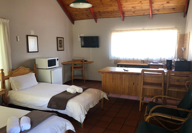 Two single beds with shower and kitchenette. Each room is equipped with air-conditioning, a bar fridge, coffee and tea making facilities and private braai (BBQ) facilities. Guests have access to gym facilities and the swimming pool.