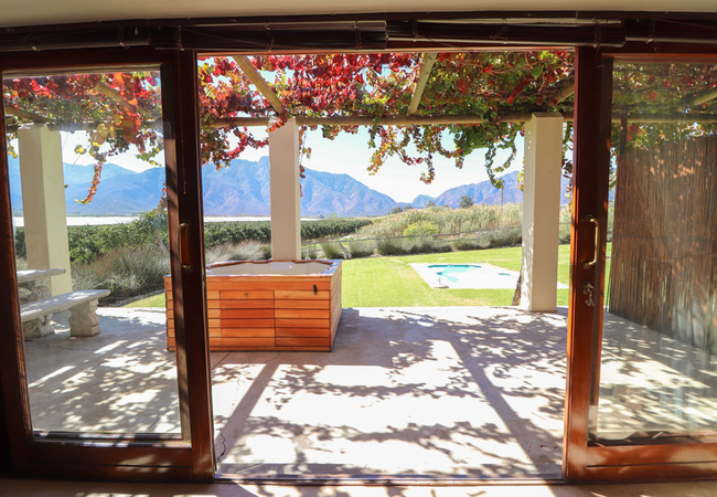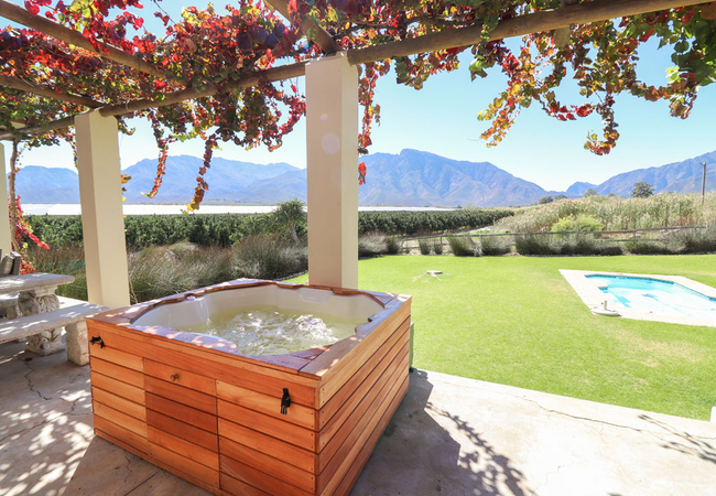 Lime Luxury Self Catering cottage features a private patio with jacuzzi, braai facilities and stunning mountain view. The cottage comprises of a fully equipped open-plan kitchen, dining area and living room with fireplace. Lime has 2 bedrooms with 1 full bathroom. The main bedroom is furnished with a Queen-size bed, the 2nd bedroom with a King-size bed or 2 single beds. All bedding and towels are provided.