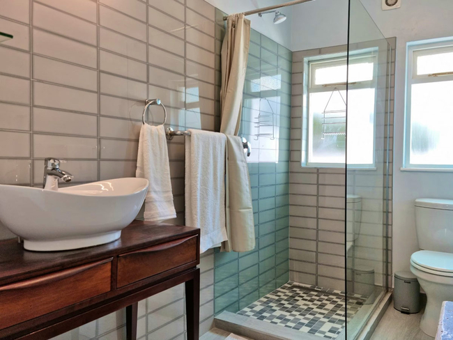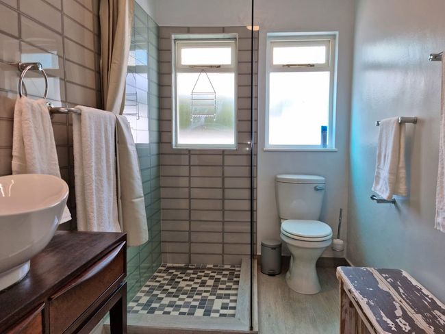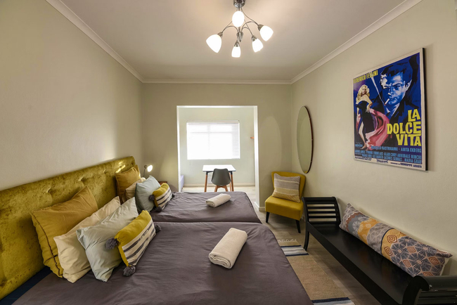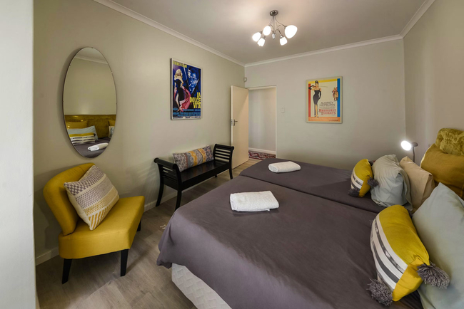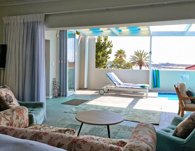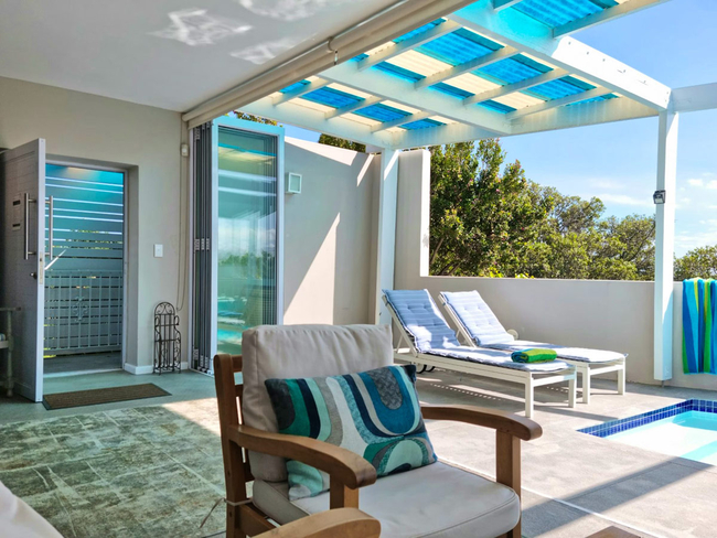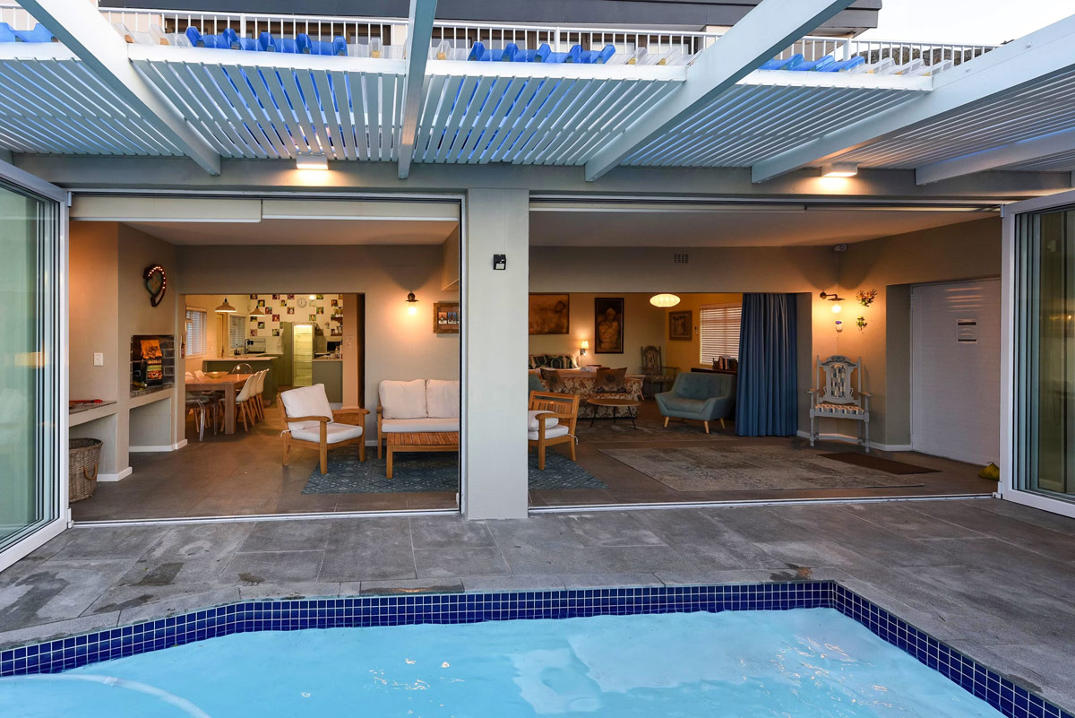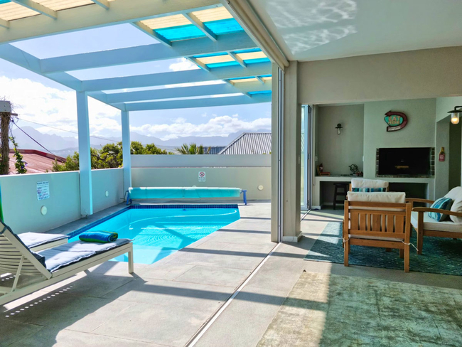 This stylish holiday villa in Gordons Bay is ideally suited for two persons but can accommodate up to four guests on a self catering basis. The beautifully furnished master bedroom can be closed off from the outdoor area by soft, flowing curtains to create greater privacy. The second bedroom is furnished with two single beds (can be converted to a double bed on request). There is a fully equipped open plan kitchen with everything you would need to cater for yourselves. The living area has TV with full DStv and a fireplace. This area opens via sliding doors onto the outdoor terrace with swimming pool. TV with Full DSTV, Swimming Pool, Free Wi-Fi, Parking and Laundry facilities.