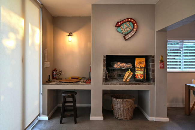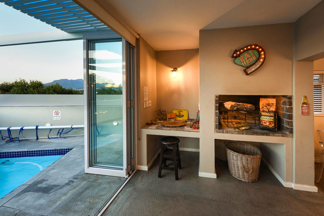 The living area has TV with full DStv and a fireplace. This area opens via sliding doors onto the outdoor terrace with swimming pool.