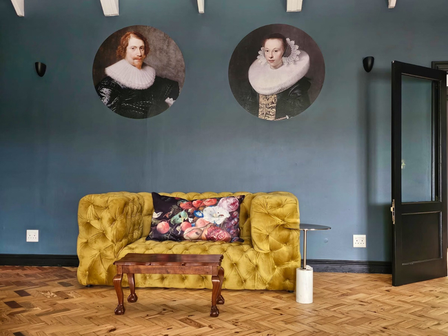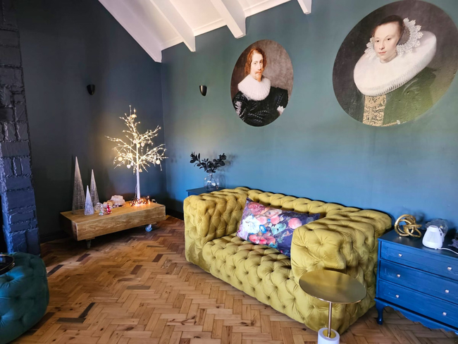 The suites and rooms at Die Heerenhuys are masterfully curated, each a unique testament to opulent design. Accommodating up to two guests, these spaces are adorned with a sophisticated palette of deep hues and gleaming gold accents, creating an atmosphere of regal splendor infused with botanical warmth. The interplay of light and shadow throughout the interiors evokes a sense of captivating luxury.