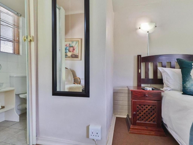 The room is comfortably appointed with a queen-size bed and a private en-suite bathroom fitted with a shower. Climate control is taken care of with both air conditioning and a ceiling fan, ensuring year-round comfort. Guests can relax in front of the television with DStv, catch up on work at the dedicated desk, or stay connected using the complimentary Wi-Fi. Practical touches include a bar fridge, microwave, and coffee and tea facilities, making the space convenient for short or extended stays. The room is non-smoking and fitted with non-feather pillows, with fresh towels provided for added comfort. Opening onto a balcony or patio furnished for outdoor use, the room enjoys pleasant garden views and a peaceful atmosphere. Ample parking is available on site. Accommodation is offered on a room-only basis, with meals available on request for those who prefer to be looked after properly, the old-fashioned way.