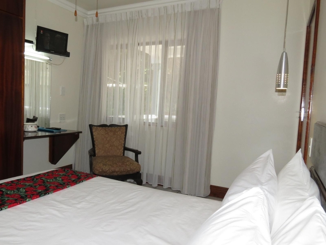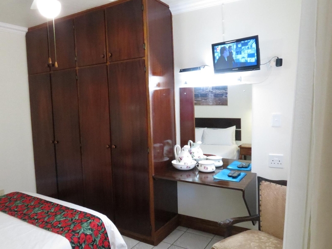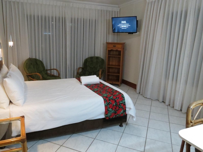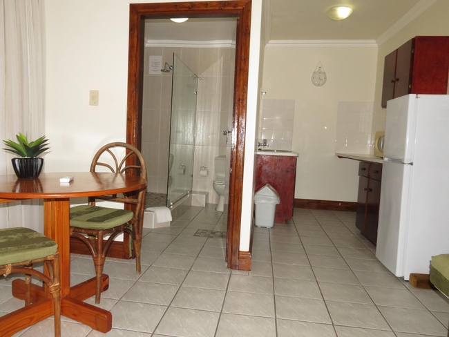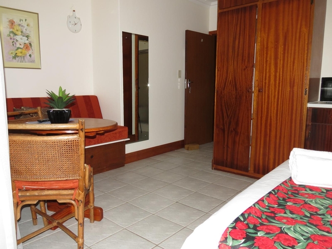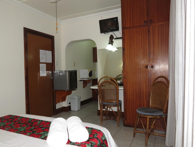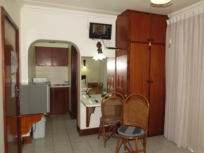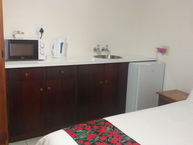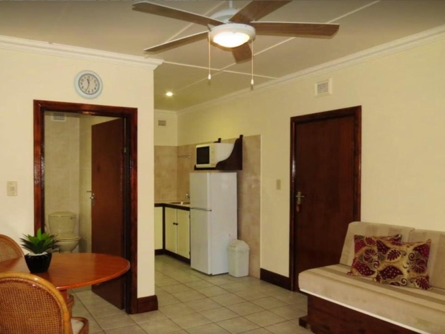 This ground-floor suite features an open-plan layout with a double bed, a well-equipped kitchenette, and an en-suite bathroom fitted with a shower, basin, and toilet. Ideal for a couple or single traveller, the suite accommodates a maximum of two guests sharing. Guests have access to complimentary Wi-Fi, a TV with DStv/Satellite channels, and a ceiling fan for added comfort. The suite includes a desk, feather pillows, and offers peaceful garden views. Additional conveniences include daily cleaning service, wake-up call options, and essential amenities such as coffee and tea facilities, a microwave, bar fridge, iron, ironing board, and bathroom toiletries. This suite is non-smoking.