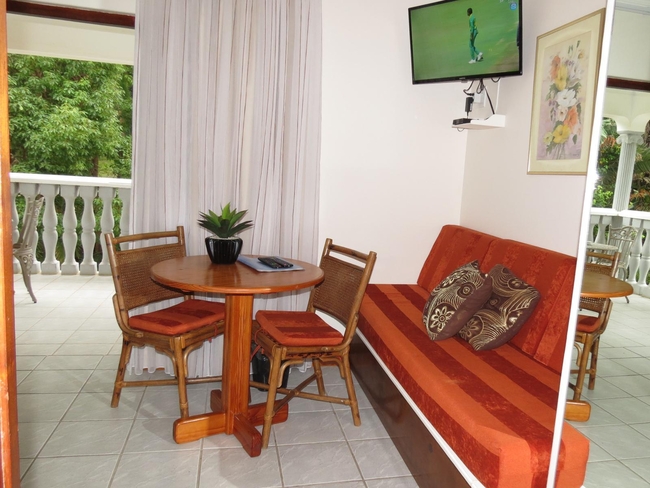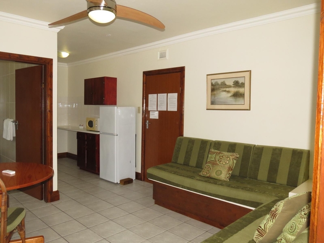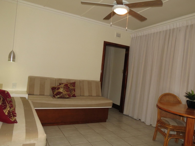 Located on the first floor, this well-appointed suite features a separate bedroom with a double bed and an open-plan living area. The lounge is furnished with two built-in couches that convert into single beds, allowing the suite to comfortably accommodate up to four adults. The private bathroom includes a walk-in shower, while the compact kitchenette is equipped with a microwave, bar fridge, and coffee and tea facilities for light self-catering. Guests can enjoy a host of thoughtful amenities, including complimentary Wi-Fi, a TV with DStv/Satellite channels, a ceiling fan, and a comfortable sitting area with a desk and dining table. Additional conveniences include daily cleaning service, wake-up call availability, feather pillows, and a private balcony with tranquil garden views. An iron and ironing board, along with essential bathroom amenities, are also provided for added comfort. The suite is strictly non-smoking.