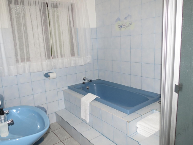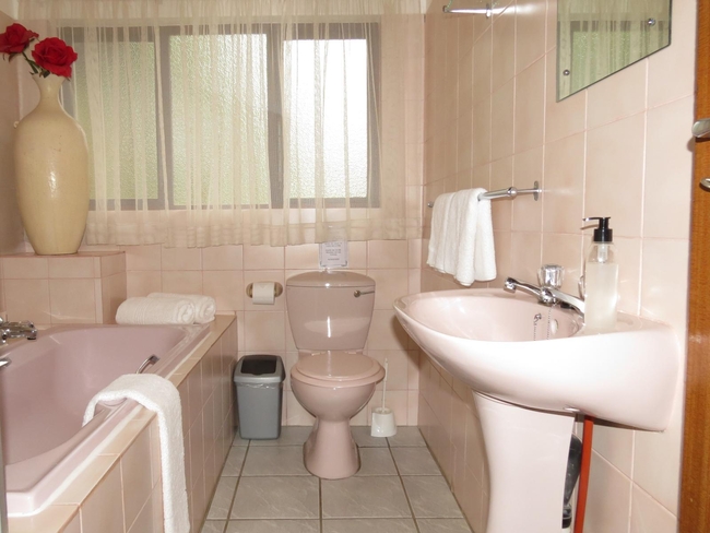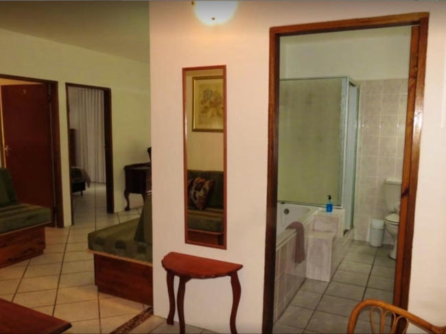 Situated on the first floor, this inviting suite features a double bed and a built-in couch that can be converted into a single bed, making it ideal for two adults or a small family. The en-suite bathroom is fitted with both a bath and a separate shower, as well as a basin and toilet. The suite also includes a well-equipped kitchenette with a microwave, bar fridge, and coffee and tea facilities. Guests have direct access to a shared balcony that overlooks the garden. This non-smoking suite offers a variety of amenities to enhance your stay, including complimentary Wi-Fi, a TV with DStv/Satellite channels, a ceiling fan, a sitting area with a dining table, and feather pillows for added comfort. Daily cleaning service is provided, along with wake-up call options, an iron and ironing board, and essential bathroom toiletries.