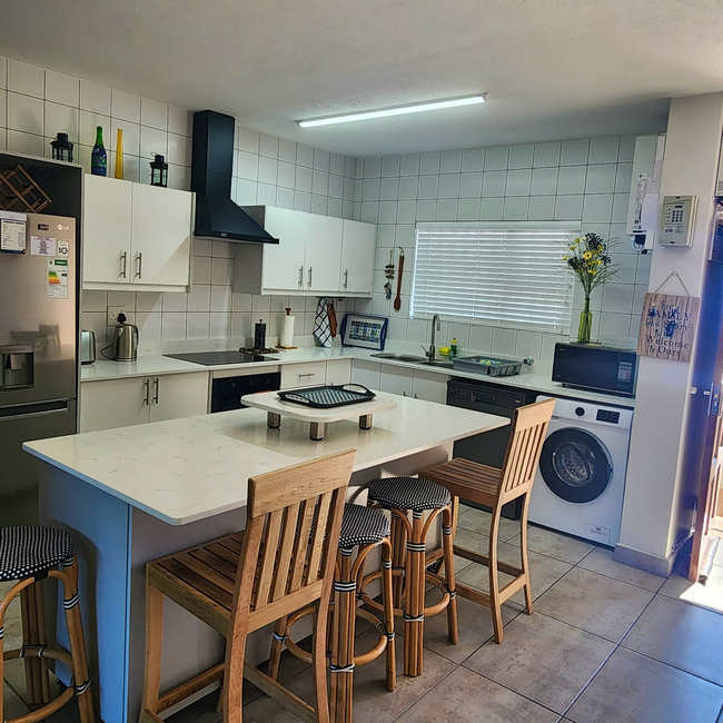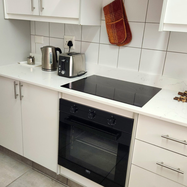 The open plan living area includes relaxed seating, a TV, and a dining space that flows naturally into the fully equipped kitchen. Here guests will find a fridge freezer, stove, oven, microwave, and tea and coffee making facilities, which make preparing meals pleasantly simple. Indoor braai facilities add a classic touch for those who enjoy a traditional South African favourite.