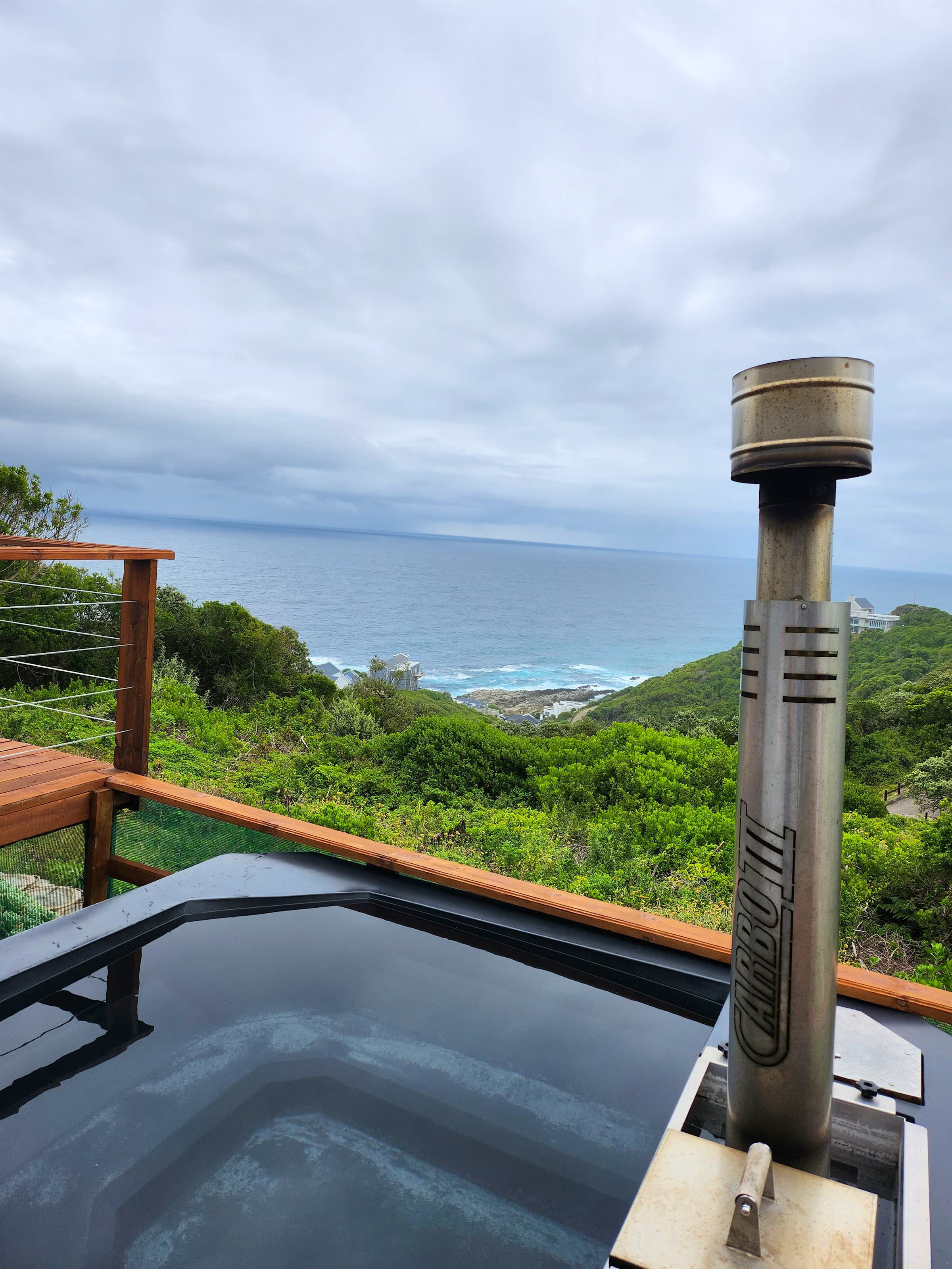 A furnished deck extends from the living area, offering panoramic views of the ocean and indigenous fynbos. The deck's crowning feature is an inviting woodfire hot tub, perfect for evening relaxation.