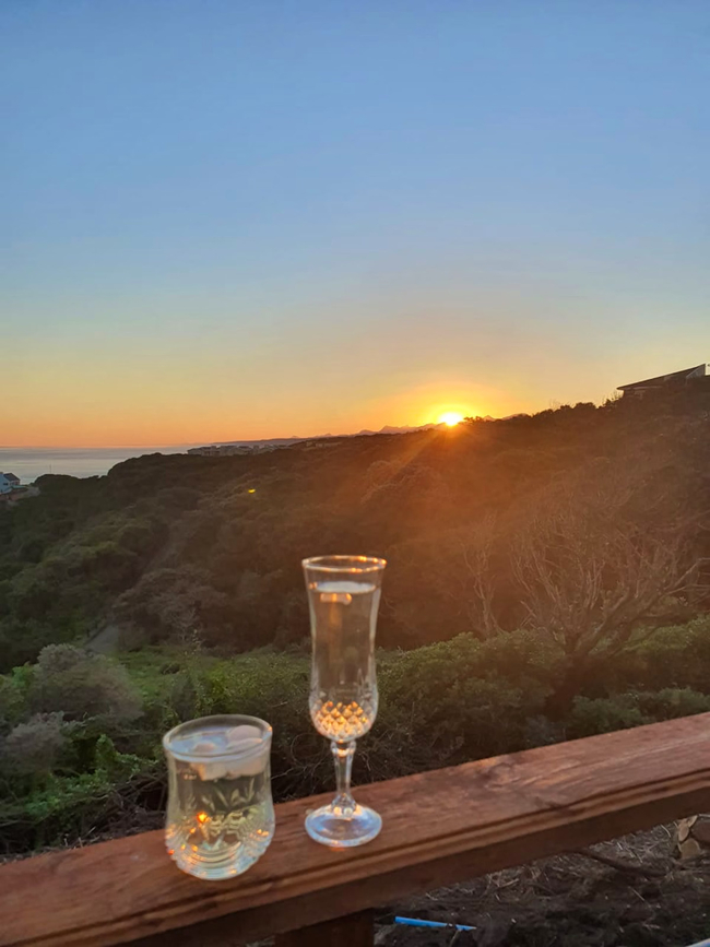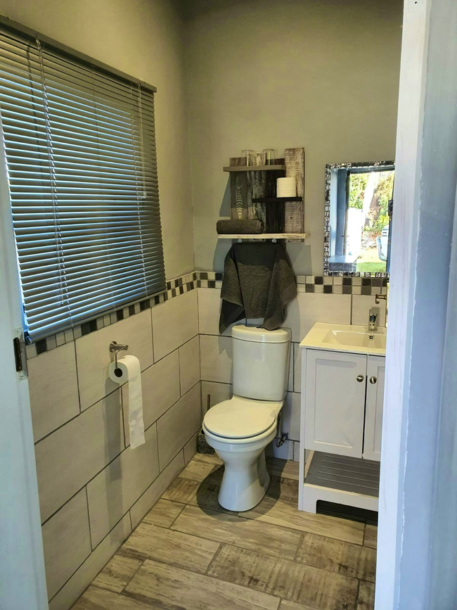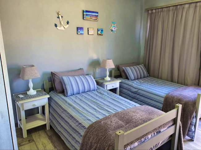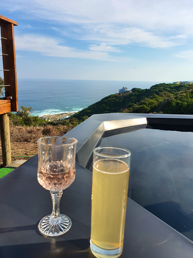 Dolly @ Skuitbaai has two en-suite bedrooms and can accommodate four guests. The main bedroom is furnished with a double bed and is air-conditioned. The second bedroom contains twin beds. Each en-suite bathroom is fitted with a shower. One bedroom leads into the living space, which has a lounge and dining area, while the other bedroom leads into the kitchen. The open-plan kitchen is equipped with a gas stove, an oven and hob, a fridge-freezer, a toaster, cutlery and crockery, as well as tea- and coffee-making facilities. The adjacent living area offers a 6-seater dining table next to an indoor braai, and the lounge area has a comfortable couch in front of a flat-screen TV with selected DStv channels (Compact Plus). There is an extra sofa bed in the lounge area. Free Wi-Fi access is available. The living area leads out onto a furnished deck overlooking the ocean and fynbos, with the deck situated right next to the woodfire hot tub. There is an inverter that provides electricity during power outages (load shedding). Guests have access to secure parking on the premises.