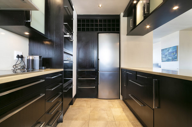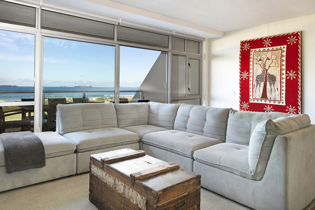 The lounge is comfortably furnished with sofas and a television, and guests can enjoy complimentary Wi-Fi throughout their stay. For added peace of mind during load shedding, the apartment is fitted with an inverter system. Glass sliding doors open from the living area onto a private balcony, complete with outdoor furniture, creating the perfect setting to relax in the fresh ocean air and take in the views.