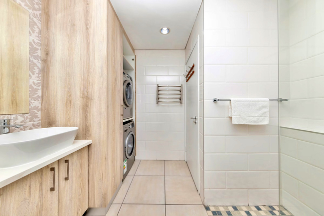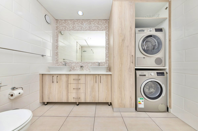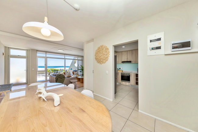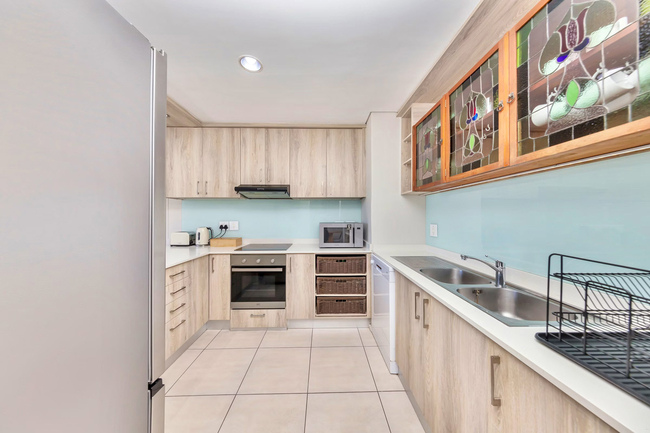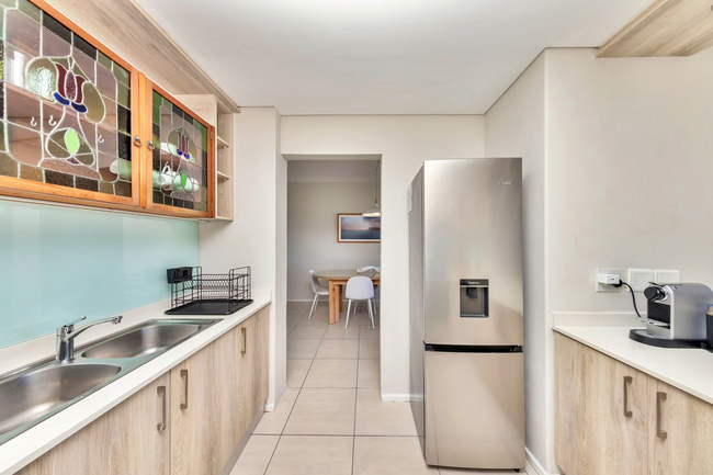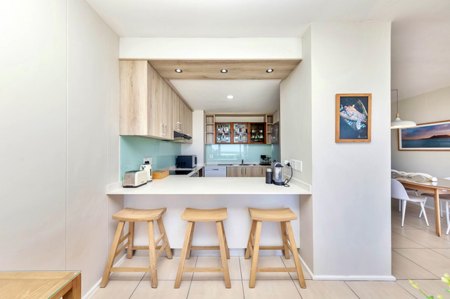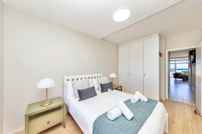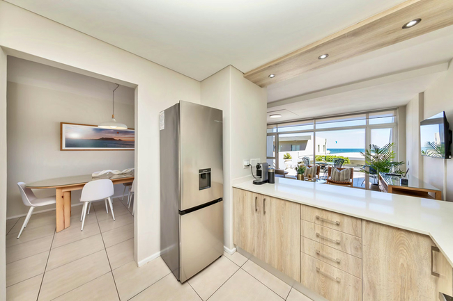The apartment is designed to accommodate up to four guests in comfort. The main bedroom is elegantly appointed with a queen-size bed and features an en-suite bathroom that includes a bath, basin, and toilet. The second bedroom, furnished with two single beds, makes use of a separate guest bathroom fitted with a shower. High-quality linen and fresh towels are provided to ensure a pleasant stay. The kitchen is fitted with modern conveniences, including a fridge-freezer, stove, oven, microwave, dishwasher, and Nespresso machine, along with cutlery and crockery for easy self-catering. A washer and dryer are also available. The kitchen extends into a dining area and flows seamlessly into the lounge, which is comfortably furnished with inviting couches and a smart TV offering Netflix and Showmax. Guests also have access to free Wi-Fi throughout the apartment. A private balcony enhances the living space, complete with outdoor seating and a Weber braai. This is the perfect spot to begin the day with a morning coffee or to end it with a glass of wine while admiring the sunset over the ocean. The unit also includes secure garage parking and is equipped with a full inverter, ensuring uninterrupted power during load shedding.