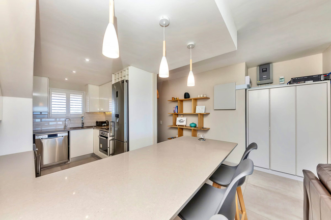 The living area extends onto a private balcony, where guests can dine al fresco while enjoying the fresh sea air and uninterrupted views of Table Mountain’s iconic outline. A gas braai is available, turning every meal into an experience enhanced by the sound of waves rolling against the shore and the striking beauty of the Atlantic horizon.