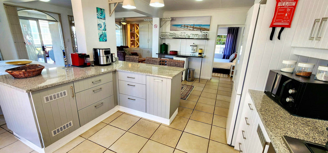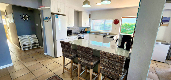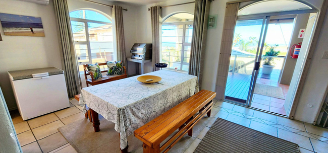 The lounge is spacious and features a comfortable suite for six guests, along with a flat-screen television, unlimited Wi-Fi, and the full DStv package. From the lounge, doors open onto a large deck with breathtaking views of the sea. This outdoor space includes a Jacuzzi with seating for six, as well as a gas braai and a kettle braai for relaxed entertaining.