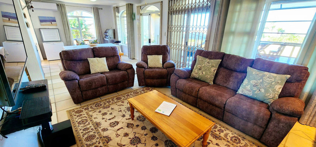 Don’s Rest is a modern and tastefully decorated apartment located within walking distance of the beach and conveniently close to the BP garage in Ramsgate Central. The property is arranged over two levels, with a permanent resident on the upper floor and the lower level available for holiday rentals. The apartment sleeps seven guests in three well-appointed bedrooms. The main and second bedrooms each feature a queen-size bed, while the third bedroom contains three single beds. The main bedroom has an en-suite bathroom, and a second bathroom is also available, both fitted with a bath, shower, toilet, and basin. Quality linen and bath towels are provided, although guests are asked to bring their own beach towels. The open-plan kitchen is fully equipped with a stove, microwave, fridge, and dishwasher, making meal preparation easy and convenient. Adjacent to the kitchen, a dining area comfortably seats six people. A separate laundry room with a washing machine and tumble dryer adds further convenience. The lounge is spacious and features a comfortable suite for six guests, along with a flat-screen television, unlimited Wi-Fi, and the full DStv package. From the lounge, doors open onto a large deck with breathtaking views of the sea. This outdoor space includes a Jacuzzi with seating for six, as well as a gas braai and a kettle braai for relaxed entertaining. Security is well considered with an alarm system, walled boundaries, and an automated entrance gate. The property provides a carport and additional parking, accommodating a total of three vehicles. A fully automated generator ensures continuous power during load-shedding, and a 25,000-litre backup water supply is plumbed into the system to cover any water outages.