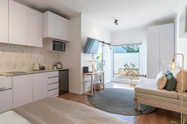 This newly renovated studio apartment offers a stylish and functional space for a comfortable stay. The well-equipped kitchenette features a fridge, microwave, SMEG two-plate stove, and coffee/tea facilities, making meal preparation a breeze. The modern bathroom boasts a walk-in shower, a hairdryer, and a plush bathrobe for added luxury. A custom-made pull-out sofa bed provides extra sleeping space, making it ideal for children or additional guests. The suite opens onto a patio with outdoor furniture, perfect for relaxing in the fresh air. Additional amenities include complimentary Wi-Fi, a TV with DSTV/Satellite channels, air conditioning, and a sitting area. A desk provides a convenient workspace, while the private safe and daily cleaning service ensure a worry-free experience. The apartment is non-smoking and wheelchair-friendly, catering to a range of guest needs. For added convenience, an iron and ironing board are also provided.
