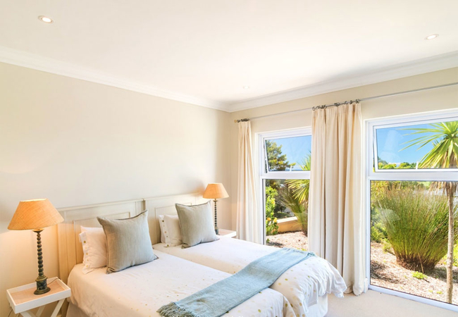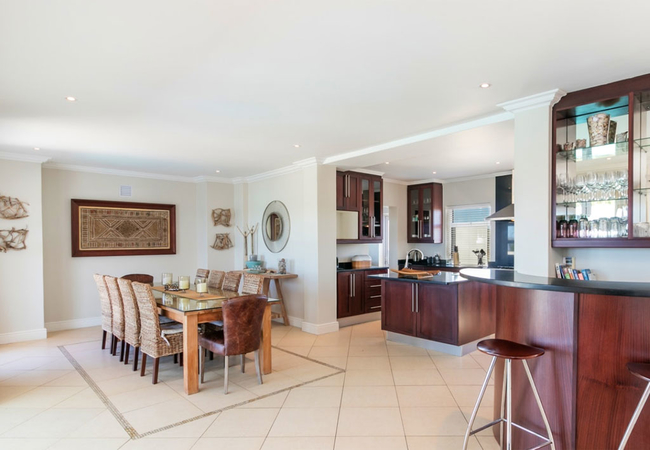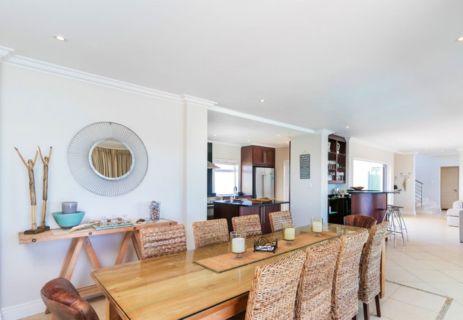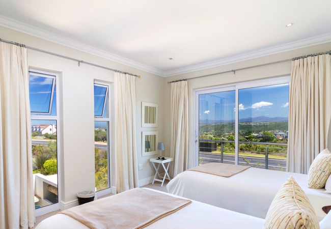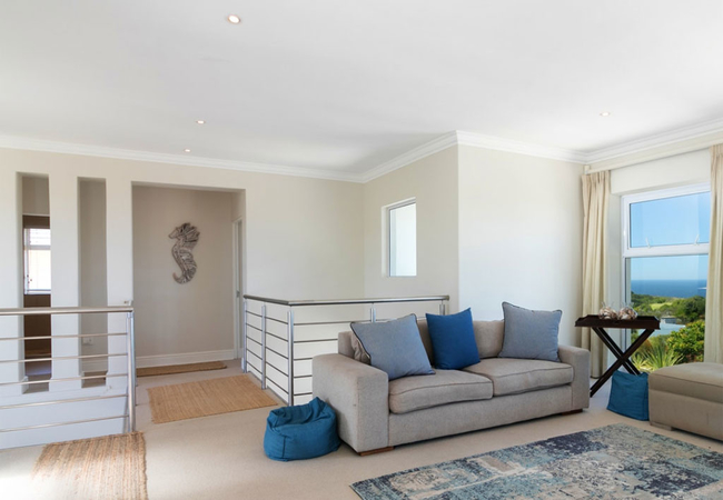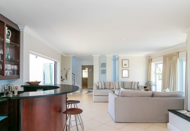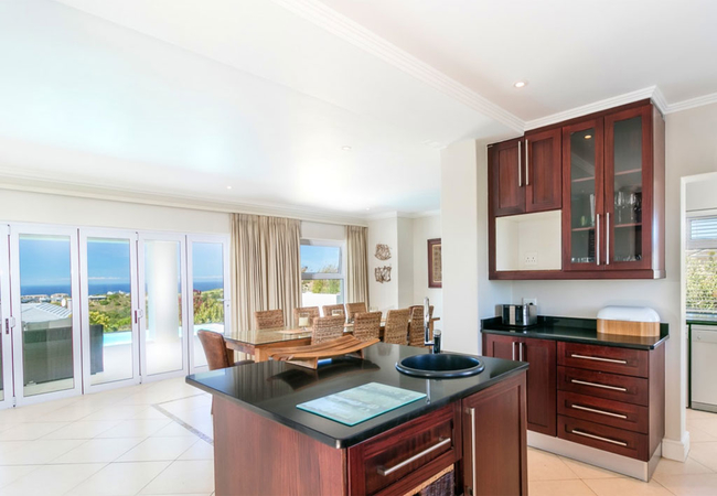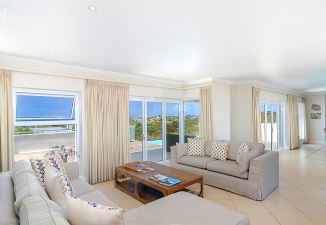 Sheerline Close Luxury Home is situated on the Pezula Golf Estate in Knysna. This double storey luxury house is a self catering home offering accommodation for 10 guests. The self catering holiday house has five bedrooms and three bathrooms. The rooms are furnished either with two single beds or a King-size bed. The bathrooms have a bath or shower or both. Bed linen and towels are provided. There is an open plan kitchen, living and dining area. The kitchen is well equipped for self catering and braai facilities are provided outside. The living area is comfortably furnished and opens out onto a front entertainment patio with a rim flow pool which overlooks the Indian Ocean. The sheltered rear patio is perfect for an evening braai. Garage parking is provided. Our Guests have access to the award winning Pezula Golf course, a swimming pool and clubhouse and a tennis court in the estate. The hotel offers a spa, a gym, an age-restricted indoor heated pool, two restaurants and a play area for children.