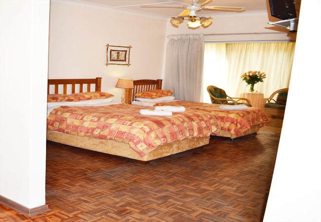 Family Rooms are furnished with one double bed and one single bed (sleeps three guests). Rooms have a private entrance, en-suite bathroom equipped with a toilet, hand basin and shower. Other facilities include coffee and tea facilities, a telephone service, TV with DStv, security gates and a dining room / lounge. Secure parking is available on site.