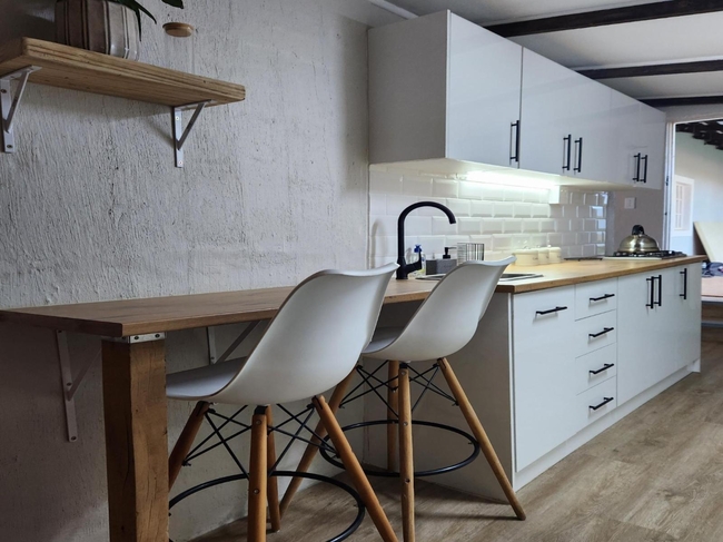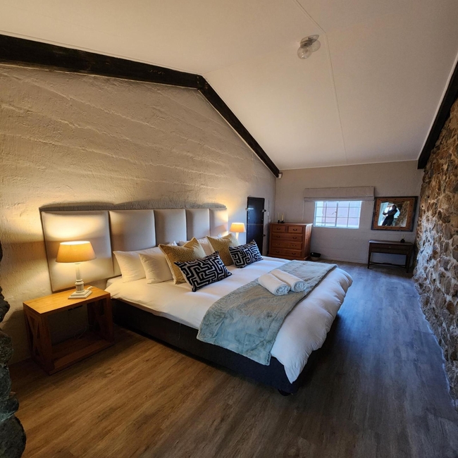 The Old Tack Room is a charming and cozy studio, fully equipped for a comfortable stay and offering complete privacy with its own entrance and access to a peaceful courtyard. The suite can be arranged with either a king-size bed or two extra-length single beds, making it ideal for couples or friends traveling together. Guests can enjoy a variety of thoughtful amenities, including Wi-Fi, a comfortable sitting area, and daily cleaning service. The unit is non-smoking and features a full kitchen, refrigerator, microwave, coffee and tea facilities, and bathroom amenities. Outdoors, a patio with furniture, a dining area, and braai/barbecue facilities provide the perfect setting for enjoying the mountain views and fresh air.