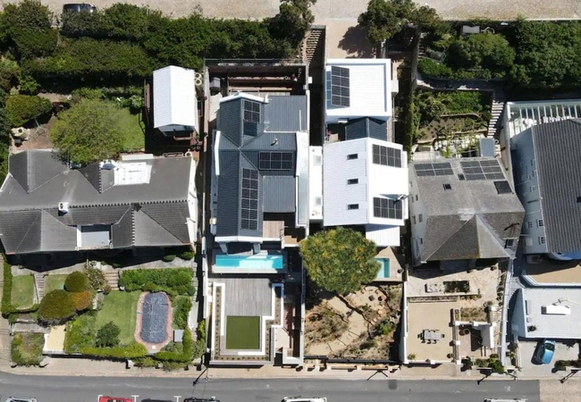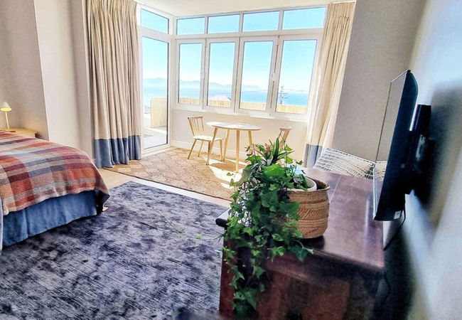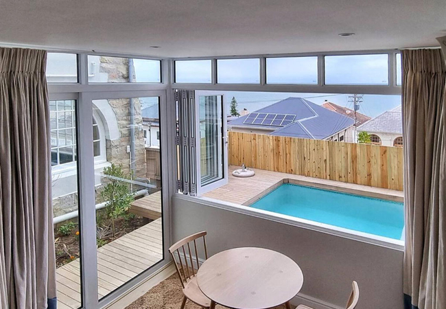 Guests can unwind on the pool deck and around the braai pit, taking in expansive views over False Bay. Parking is available. The guest house has solar panels with battery back-up in case of loadshedding.