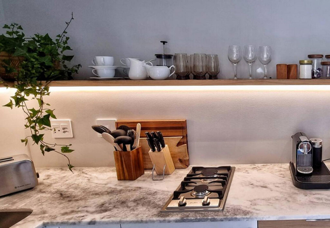 Each suite is furnished with a comfortable Queen-size bed and an opulent en-suite bathroom, one fitted with a shower only, the other with a tub and shower. The suites have private kitchens equipped with a stove, fridge and tea and coffee facilities. A TV and Wi-Fi access is available in each suite which has a private entrance.