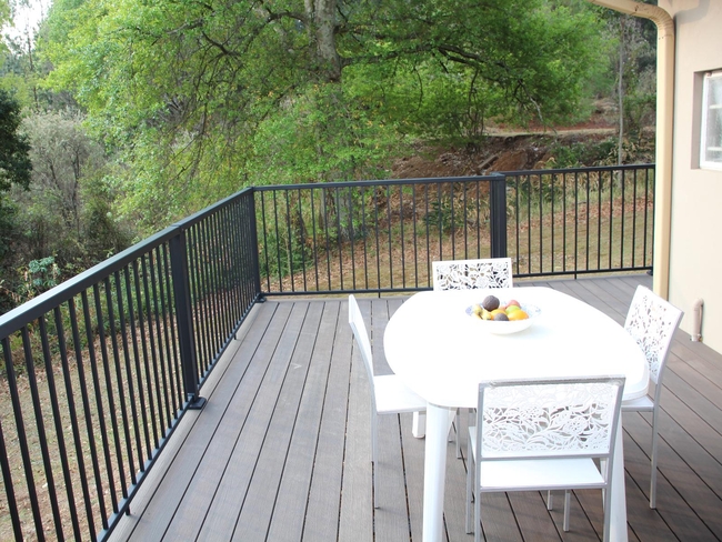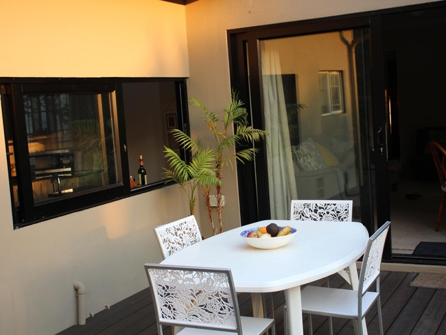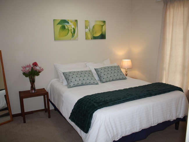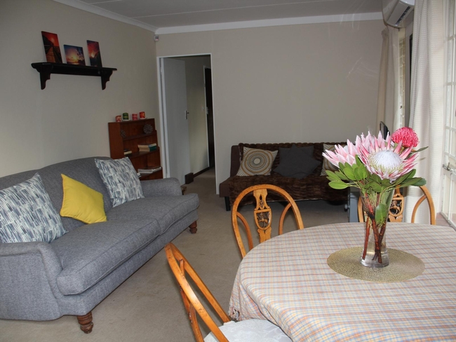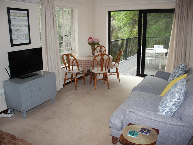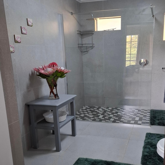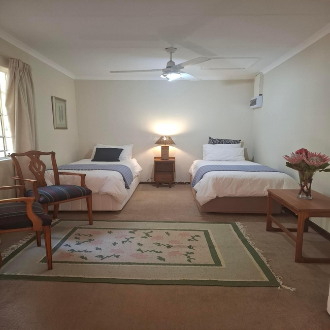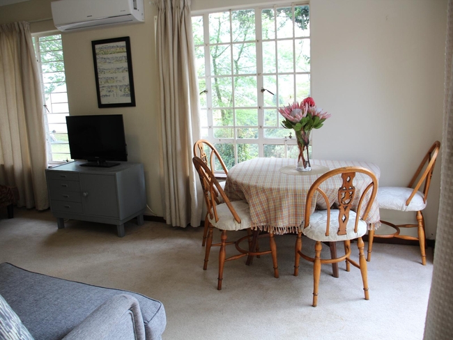 The Cottage, ideal for a smaller group, accommodates up to 4 guests with its two bedrooms and two bathrooms. It features a well-equipped kitchen that offers easy access to an adjacent open deck overlooking the indigenous forest. The air-conditioned living and dining area invites comfort year-round, with sliding doors opening to the deck in summer and a gas heater ensuring warmth in winter. The deck, complete with a braai facility and seating for four, is an inviting space for outdoor gatherings.