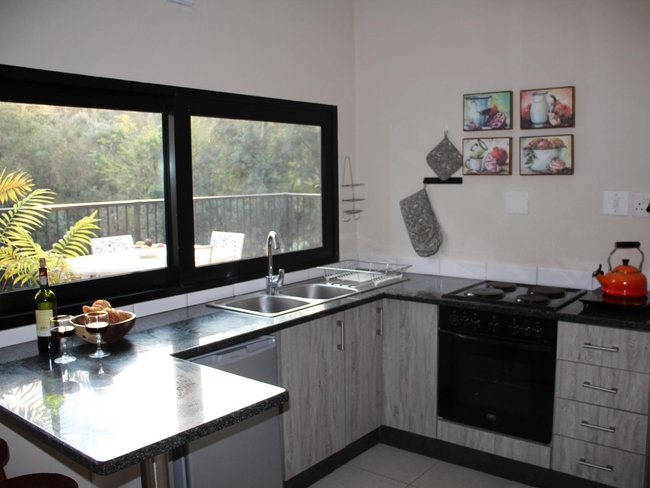 Designed for self-catering, the fully equipped kitchen seamlessly flows into the lounge, which extends to a covered verandah—perfect for both entertaining and relaxation. With braai facilities on the verandah and surrounding the elevated property, guests have multiple options for outdoor dining, whether it's enjoying a leisurely breakfast or winding down with an evening dinner while soaking in the picturesque scenery.