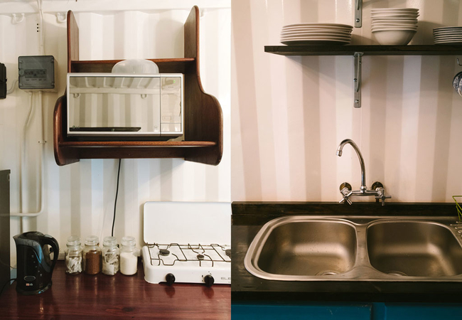 Piet-Se-Kinders Containers are four separate bedrooms each with two single beds and a coffee station. The beds all have crisp white percale linen. Open plan kitchen dining area is fully equipped with: fridge / freezer, microwave, two plate gas hob. There is a bathroom with a shower. Two more bathrooms are located in a separate building next to the containers.