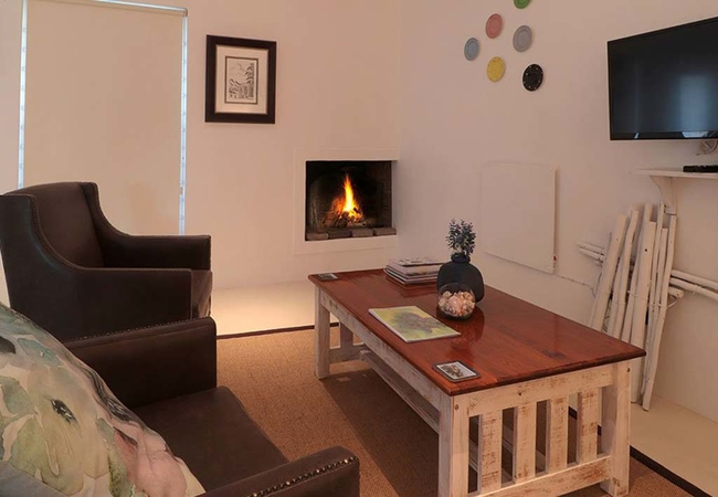 The open plan living area consists of a well equipped kitchenette with a two plate stove / oven, microwave, small fridge and a kettle. The sitting area has an indoor fireplace and a TV with satellite channels.