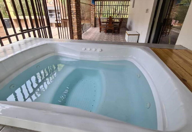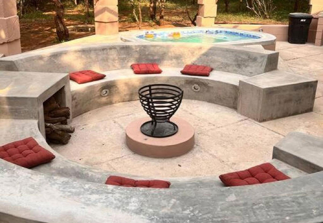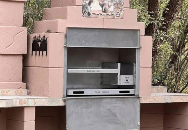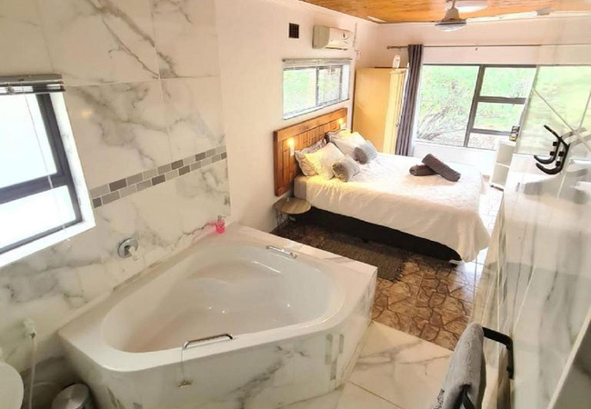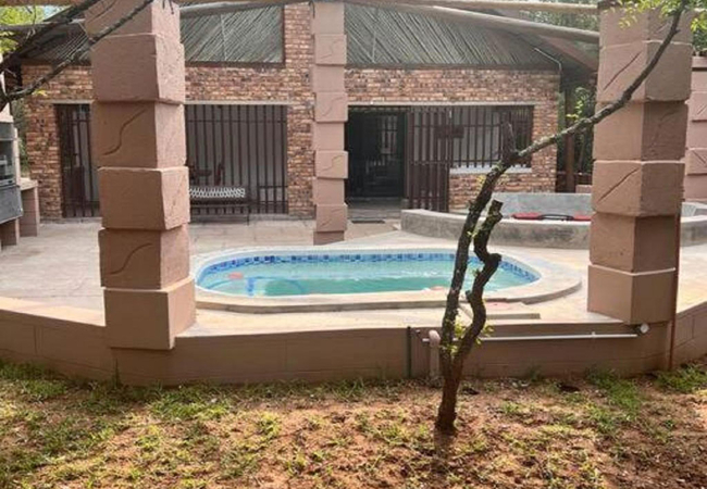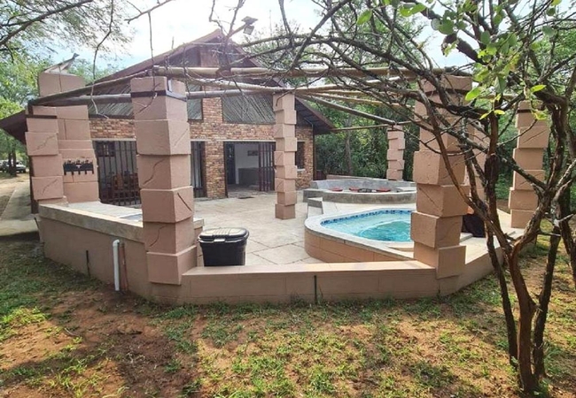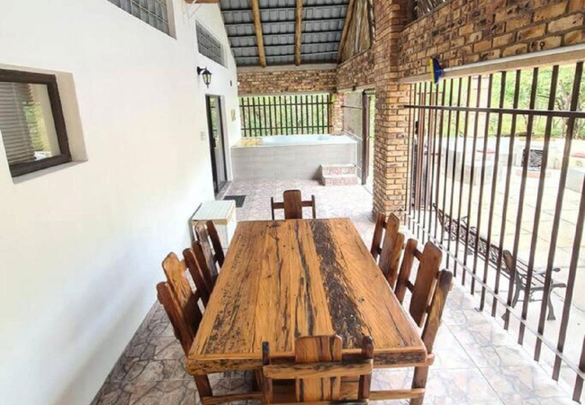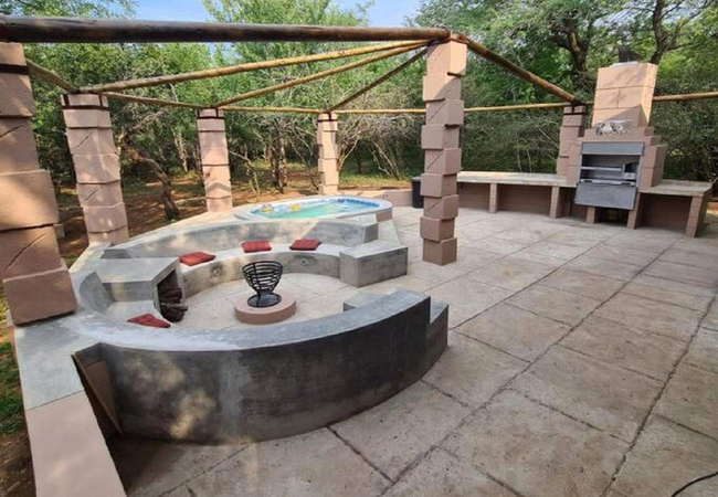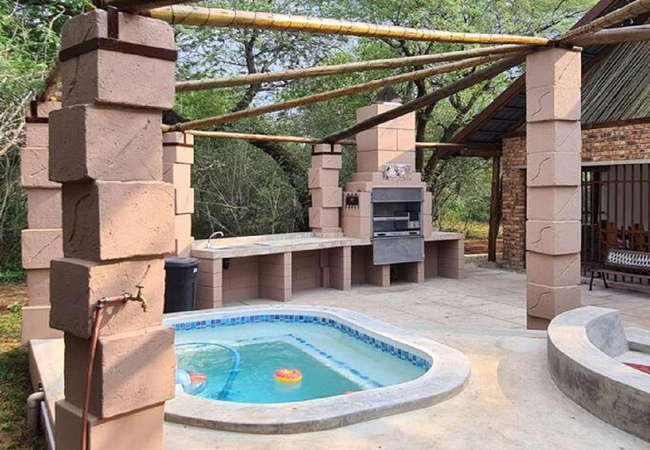 Dream Inn has two en-suite bedrooms. The first bedroom is furnished with a Queen-size bed and offers an en-suite bathroom fitted with a deep soaking bath, basin, toilet and a hairdryer. The second bedroom has a Queen-size bed and a three-quarter bed. The en-suite bathroom is fitted with a shower, toilet, basin, washing machine and hairdryer. Both bedrooms have air-conditioning and ceiling fans. The modern open-plan kitchen is fully equipped for self-catering and contains a gas stove, oven, fridge-freezer, microwave, air fryer, cutlery, and crockery. There is also a breakfast bar with stools. The lounge has a comfy lounge suite and a Smart TV. Guests can also enjoy complimentary, unlimited Wi-Fi access. The living area opens up onto an undercover patio area, which has outdoor dining furniture and a Jacuzzi with a prepaid electricity metre for guests' own account. The outdoor entertainment area offers a private splash pool, which provides refreshing relief during the warmer summer months, as well as a built-in braai and a sunken fire pit in the boma, where guests can enjoy the animal sounds at night.