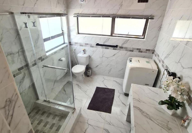 The first bedroom is furnished with a Queen-size bed and offers an en-suite bathroom fitted with a deep soaking bath, basin, toilet and a hairdryer. The second bedroom has a Queen-size bed and a three-quarter bed. The en-suite bathroom is fitted with a shower, toilet, basin, washing machine and hairdryer. Both bedrooms have air-conditioning and ceiling fans.
