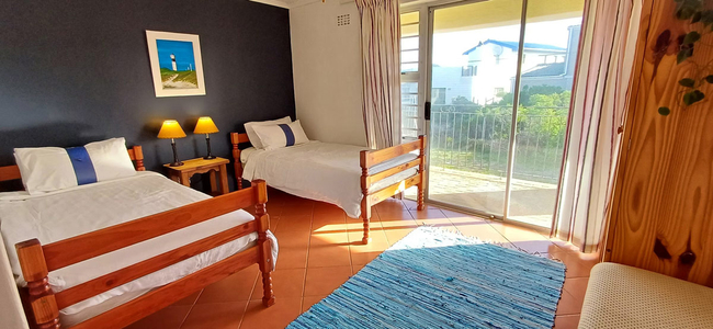 The two additional bedrooms are next to each other on the bottom floor and share a large bathroom with shower. Both bedrooms have ceiling fans and sliding doors that leads out to a covered stoep / veranda. Both bedrooms have 2 single beds each. In the other bedroom the single beds can be pushed together to make a 'king' size bed. A cot is available upon request.