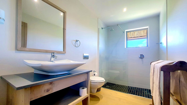 The villa features three beautifully appointed bedrooms, each with a queen-size bed and a private en-suite bathroom. Every bathroom is fitted with a gas-powered shower, a toilet, and a washbasin, ensuring both convenience and sustainability. The home comfortably accommodates up to six guests, making it ideal for families or small groups.